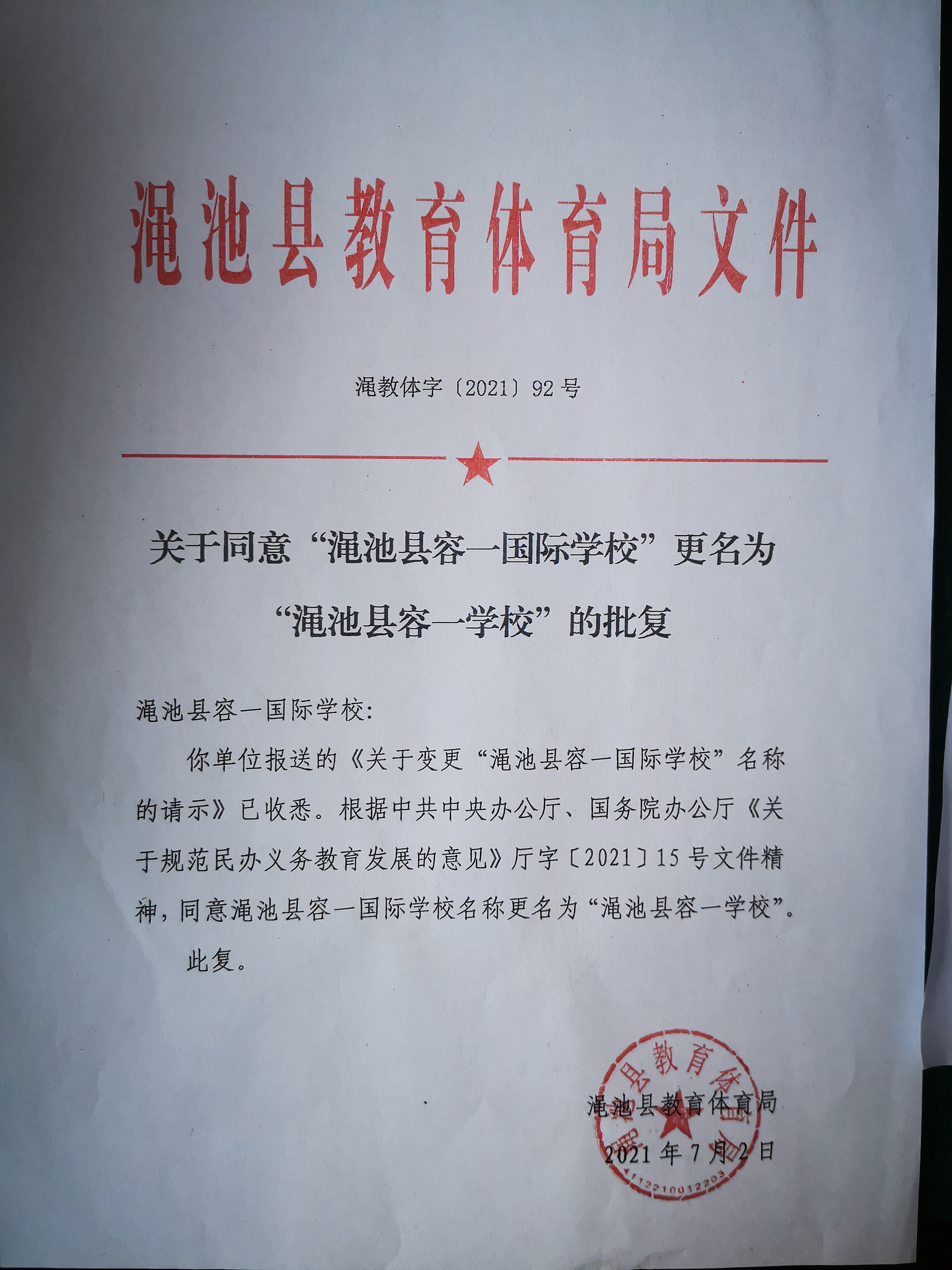 關(guān)于同意“澠池縣容一國(guó)際學(xué)校”更名為“澠池縣容一學(xué)校”的批復(fù)